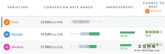 我预测Georgia字体最适合我的网站,因为他可读性很强。Verdana最不适应我的网站。 和我预测的一样,Georgia确实最适合我的网站,但是Verdana字体不是最差的那个。使用Verdana字体时文章的点击量比使用Arial字体时多29.1%。